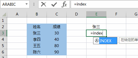 ![]() 先看 MATCH(E2,B2:B6,0),是返回"张三"在B2:B6的位置,是2。 那么把MATCH(E2,B2:B6,0) 换成2 :INDEX(C2:C6,2),就是30了。 调用数据的一个方法,调用张三 在另个位置对应的数据。(责任编辑:admin) |